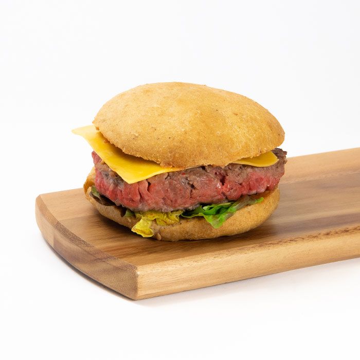 Steak frais de 150g, Ketchup, Moutarde, Pickles, Cornichons, Oignons, Tomate, Salade & Cheddar maturé.